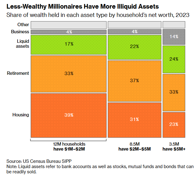 Despite this relative affluence, today’s millionaires rarely have anywhere near $1 million to spend however they want. For the barely-millionaires, households with a net worth between $1 million and $2 million, the vast majority of that wealth is illiquid. They typically had 66% of their wealth tied up in a primary home and retirement accounts in 2023, an increase of eight percentage points since 2017.