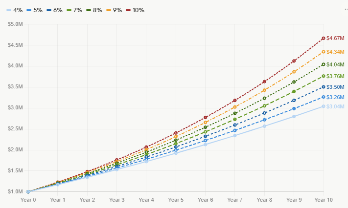 I hate my job. Can you help me retire in 10 years? I’m already 45 years old and have only about $1 million saved. I am the only income earner out of a family of four with a wife + 2 grade school children. I make about $300k+ a year. I plan to max all my tax advantage contributions every year totaling about $80,000 + another $50,000 into a taxable account. I spend an average of $12,000 total for the family per month including mortgage, car, expenses and vacations. How should I invest so that I can retire at 55? How much do I actually need to retire at 55 while supporting the family? I’m thinking $3.5 million but even that is worrisome. Also what growth rate do you assume year over year? I use 4% or 5%, which gives drastically different numbers. I do have about $30k in cash savings but plan to build that up to about 3 years of expenses. Did I mention I hate my job?