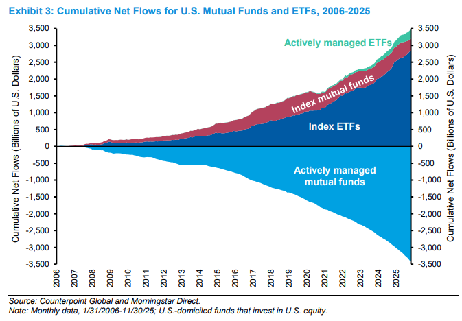 But for all intents and purposes, indexing won over active management (via Morgan Stanley):